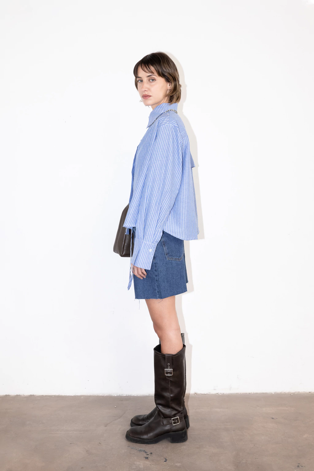 Bermuda oversized en denim rígido azul. Cinco bolsillos.