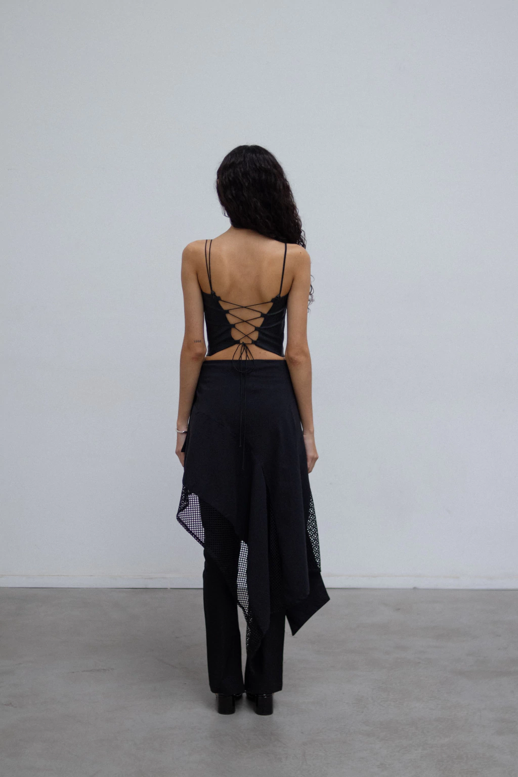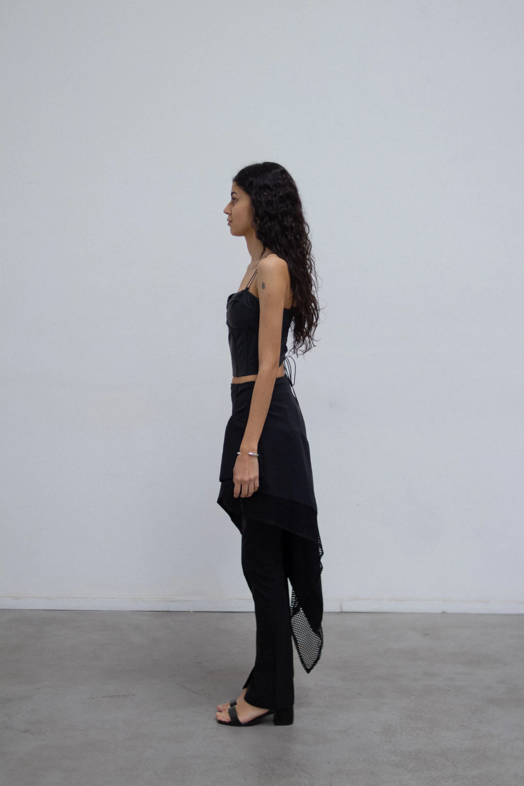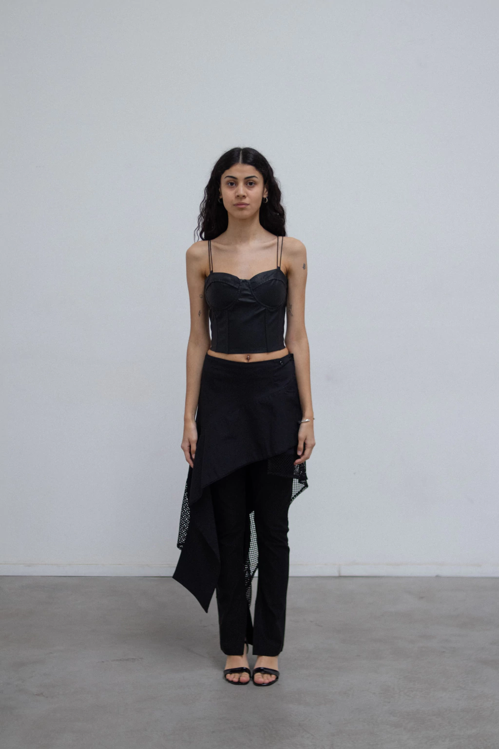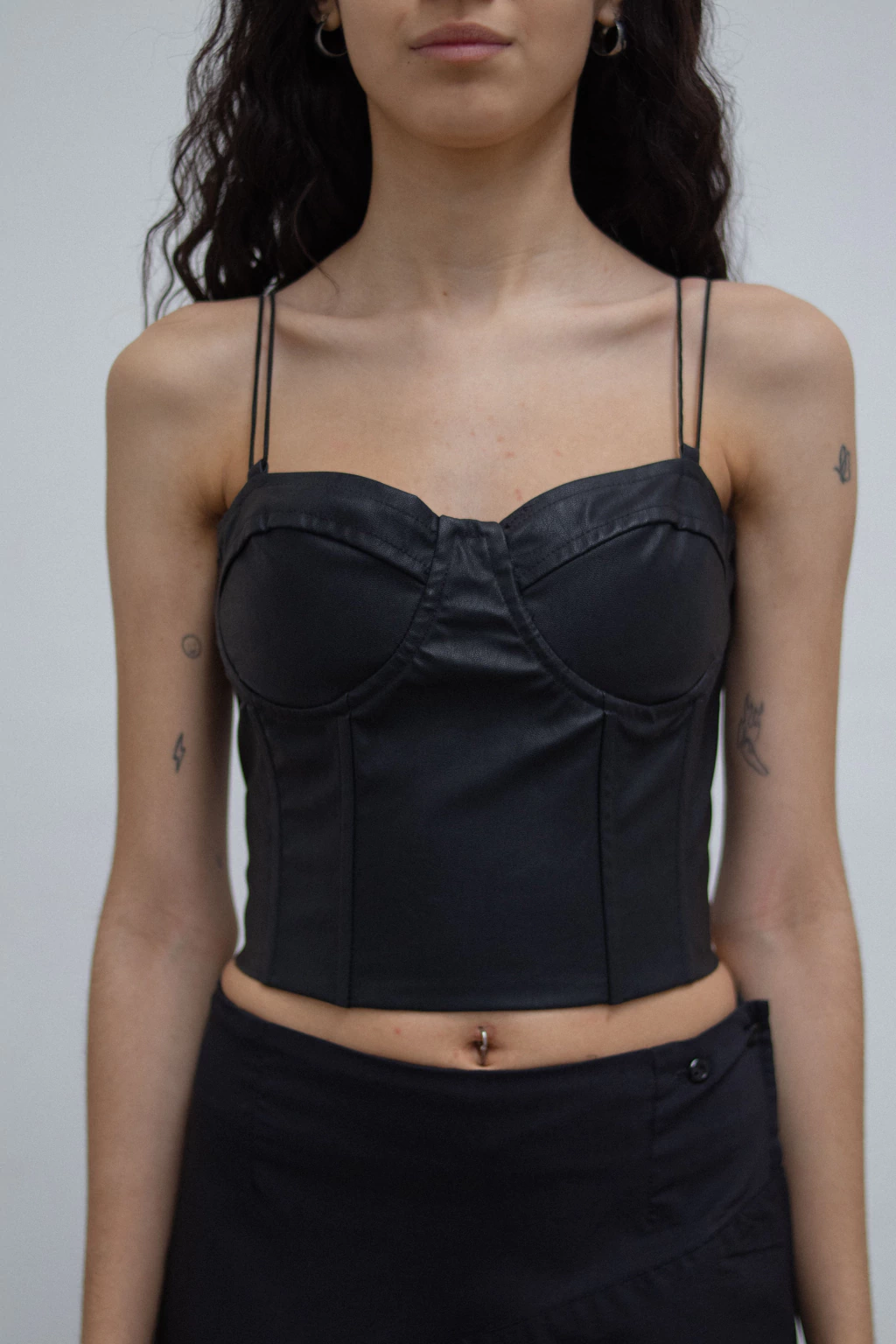 Bustier de ecocuero con tazas y tiras en espalda. Tiene estructura corsetera y está completamente forrado en su interior.