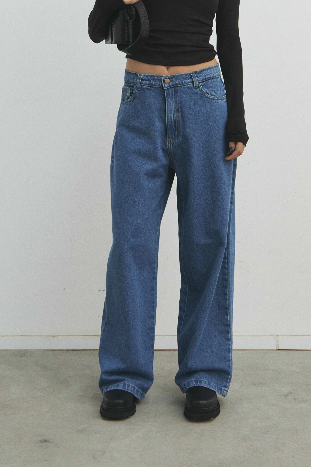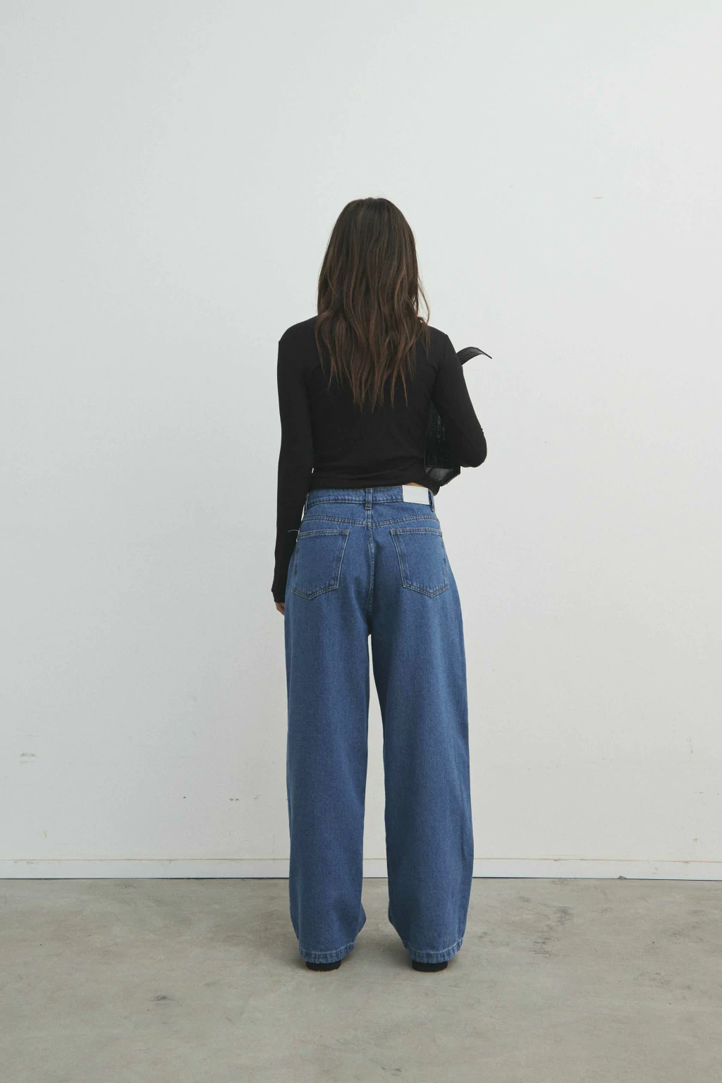 Jean oversized en denim rígido azul medio. Cinco bolsillos.